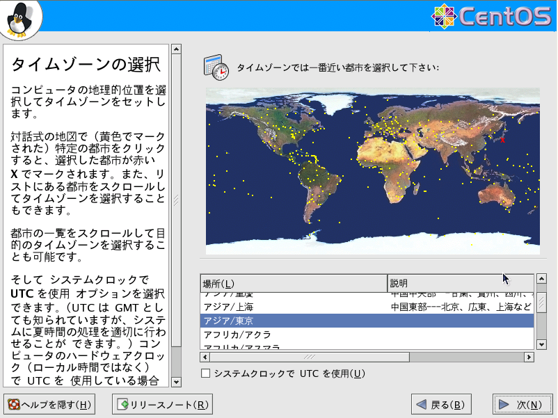 場所(L)の表から「アジア/東京」を探し出して、選択して、