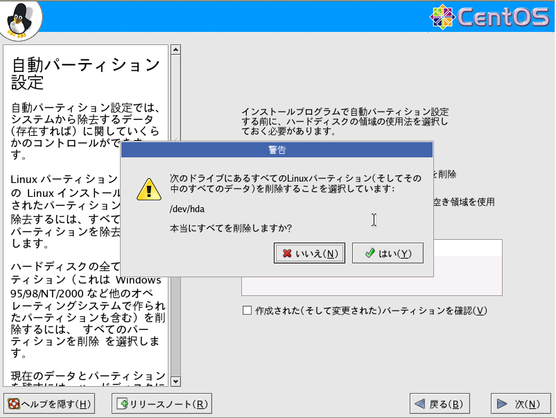 ↑システムのすべてのLinuxパーティションを削除を選んだ場合に、