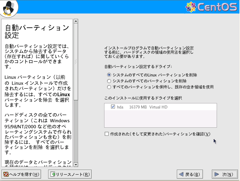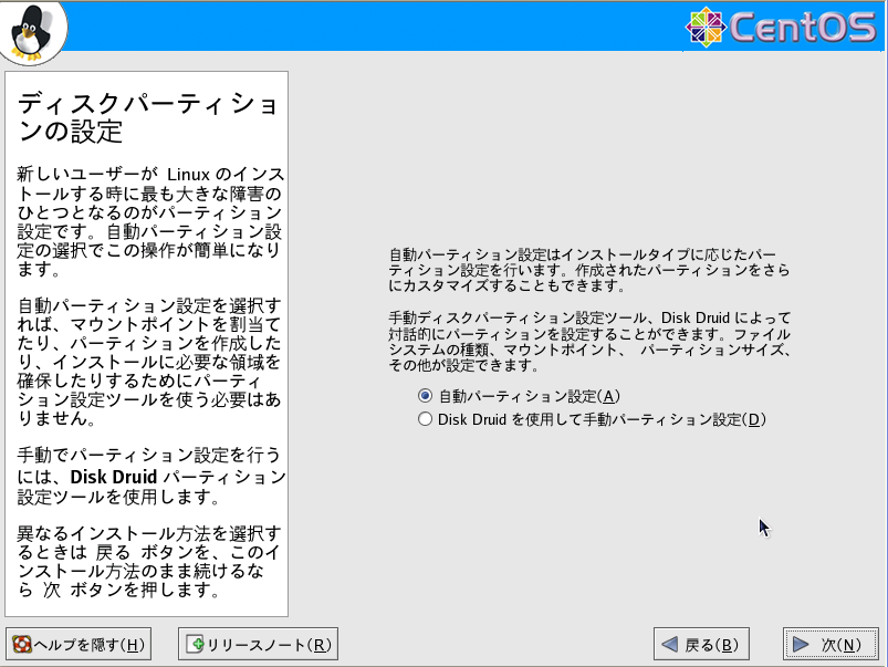 普通の場合は自動パーティション設定にしてください。